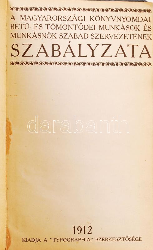 A Magyarországi Könyvnyomdai, Betü- és Tömöntődei Munkások és Munkásnők Szabad Szervezetének szabályzata. Bp., 1912, Typographia. Egészvászon kötés, belül gerincnél szakadt, kissé kopottas állapotban.