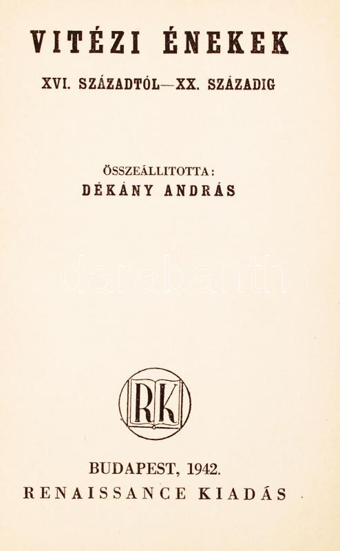 Dékány András: Vitézi énekek XVI. századtól XX. századig. Bp., 1942 Re... https://www.darabanth.com/hu/207-Gyorsarveres/207.0/Festmeny-mutargy-papirregiseg-egyeb/Konyvek-Egyeb-ritkasagok~600040/Dekany-Andras-Vitezi-enekek-XVI-szazadtol-XX-szazadig-Bp-1942-Rennaissance-64p~II827583