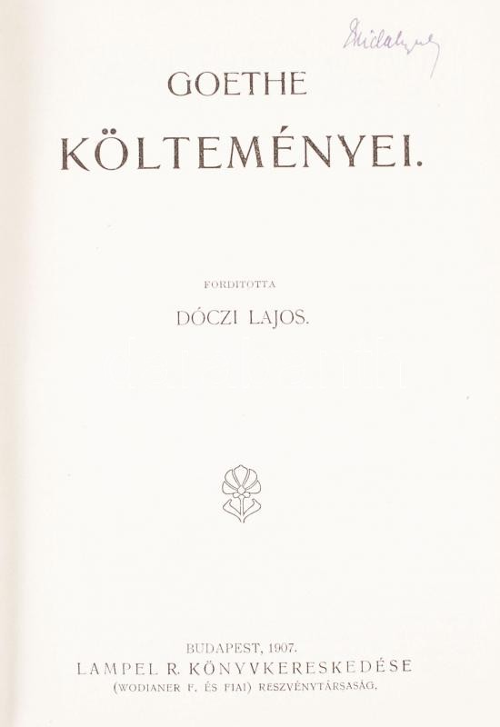 Goethe költeményei. Fordította Dóczi Lajos. Remekírók Képes Könyvtára. Bp., 1907, Lampel R. Könyvkereskedése. Kiadói aranyozott, festett egészvászon kötés, jó állapotban.
