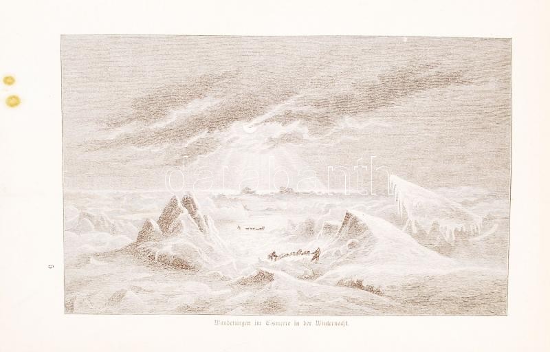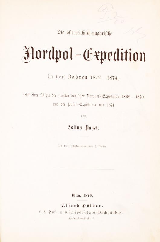 Julius Payer: Die österreichisch-ungarische Nordpol-Expedition in den Jehren 1872-1874, nebst einer Skizze der zweiten deutschen Nordpol-Expedition 1869-1870 und der Polar-Expedition von 1871. Mimt 146 Illustrationen und 3 Karten. Wien, 1876, Ulfred Hölder. Kiadói aranyozott egészvászon kötés, gerincnél szakadt, belül levált, festett lapszélek, kopottas állapot.