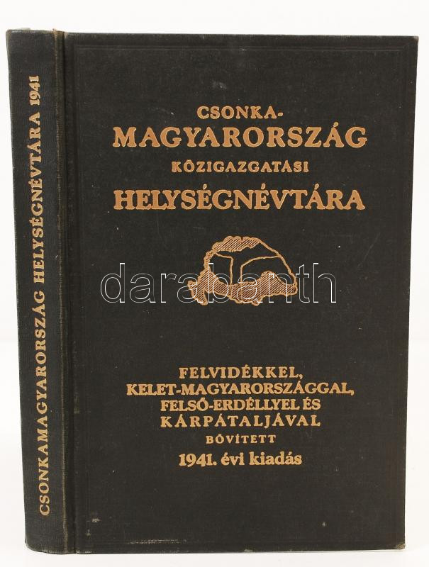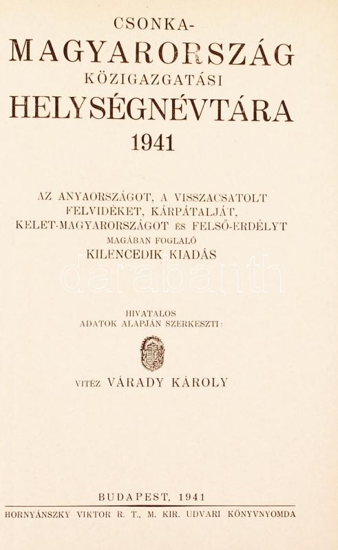 vitéz Várady Károly (szerk.): Csonka-Magyarország közigazgatási helységnévtára 1941. Az anyaországot, a visszacsatolt Felvidéket, Kárpátalját, Kelet-Magyarországot és Felső-Erdélyt magában foglaló kilencedik kiadás. Bp., 1941, Hornyánszky Viktor. Kiadói aranyozott egészvászon kötésben, jó állapotban.