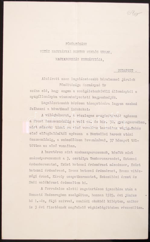 Leírás: 1933/1935 Szkv. főhadnagy Horthy Miklósnak címzett kegydíj-, illetve nyugdíj-kérelmezési levele