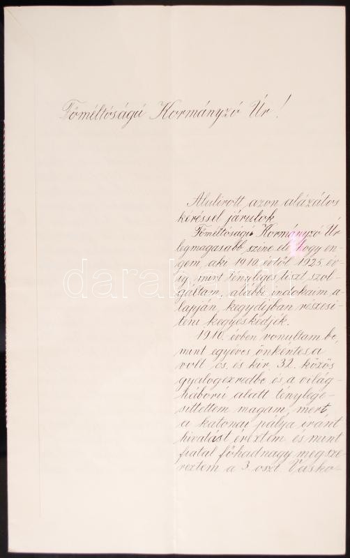 1933/1935 Szkv. főhadnagy Horthy Miklósnak címzett kegydíj-, illetve n... https://www.darabanth.com/hu/207-Gyorsarveres/207.0/Festmeny-mutargy-papirregiseg-egyeb/Militaria~600024/19331935-Szkv-fohadnagy-Horthy-Miklosnak-cimzett-kegydij--illetve-nyugdij-kerelmezesi-leve~II715437