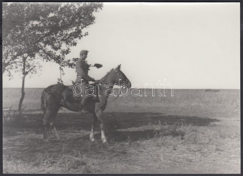 1942 Thöresz Dezső (1902-1963): A parancsnok lova. A 2. magyar hadsereg kivonulása a Don-kanyarhoz. A szerző az oda utat fényképezte, kb. 130-150 eredeti negatív őrzi a katonák harctérre vonulását, ez a kép mai másolat a gyűjteményben található eredeti negatívról, 12x17 cm