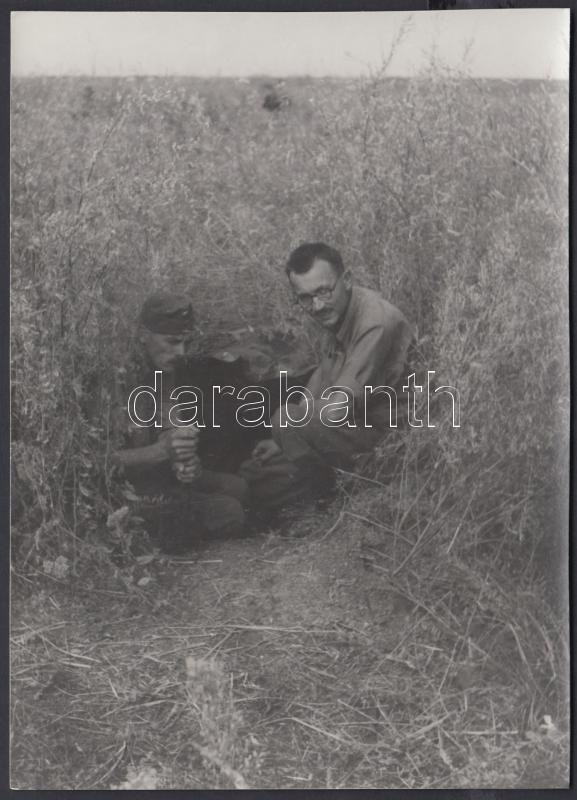 1942 Thöresz Dezső (1902-1963): Álcázott sátor előtt. A 2. magyar hadsereg kivonulása a Don-kanyarhoz. A szerző az oda utat fényképezte, kb. 130-150 eredeti negatív őrzi a katonák harctérre vonulását, ez a kép mai másolat a gyűjteményben található eredeti negatívról, 12x17 cm