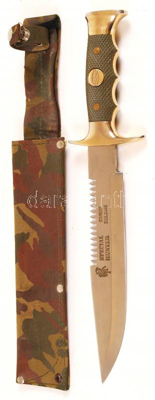 Leírás: Vadász tőrkés, jelzett, bronz markolattal, eredeti tokjában, h:34 cm