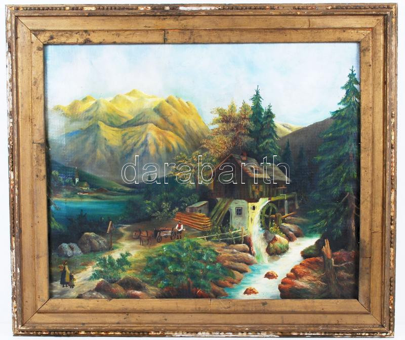 Leírás: Jelzés nélkül: Vízimalom. Olaj, vászon, kisebb gyűrődések, antik keretben, 50×60 cm