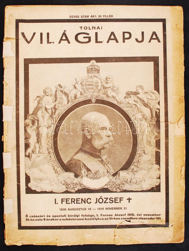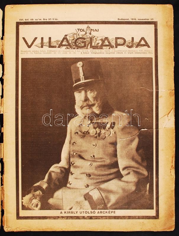1916 Tolnai Világlapja I. szám, Ferenc József halálhírével https://www.darabanth.com/hu/207-Gyorsarveres/207.0/Festmeny-mutargy-papirregiseg-egyeb/Nyomtatvanyok~600026/1916-Tolnai-Vilaglapja-I-szam-Ferenc-Jozsef-halalhirevel~II842406