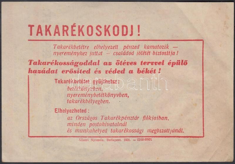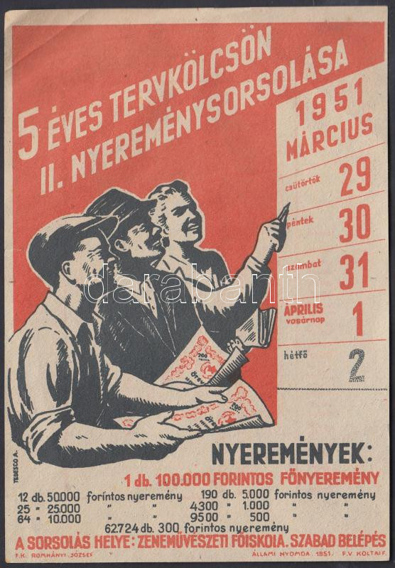 Leírás: 1951 Bp., 5 éves tervkölcsön II. nyereménysorsolása szórólap