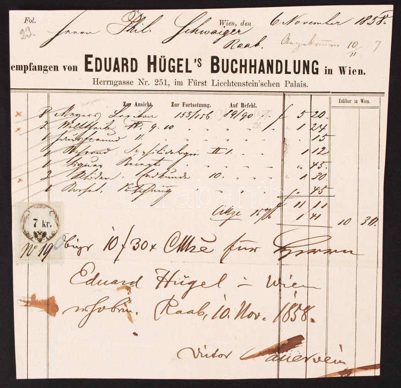 1858 Bécs (Wien), Eduard Hügel's Buchhandlung által kiállított fe... https://www.darabanth.com/hu/207-Gyorsarveres/207.0/Festmeny-mutargy-papirregiseg-egyeb/Okmanyok~600015/1858-Becs-Wien-Eduard-Hugels-Buchhandlung-altal-kiallitott-fejleces-szamla-okmanybelyeg~II843962