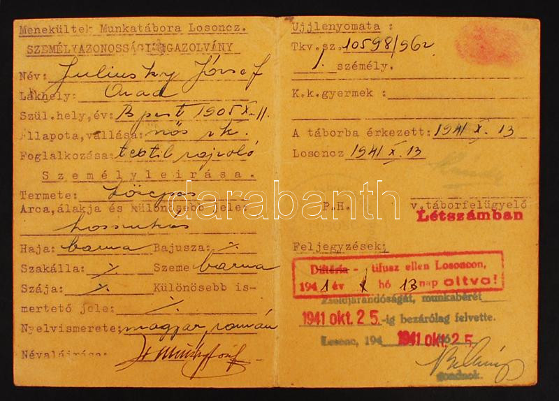 1941 Losonc, Menekültek Munkatábora által kiállított személyazonossági... https://www.darabanth.com/hu/207-Gyorsarveres/207.0/Festmeny-mutargy-papirregiseg-egyeb/Okmanyok~600015/1941-Losonc-Menekultek-Munkatabora-altal-kiallitott-szemelyazonossagi-igazolvany~II843329