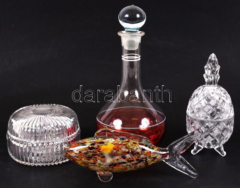Leírás: Üveg tétel (4 db): boros kiöntő, 2 db bonbonier, hal alakú asztali dísz, hibátlan