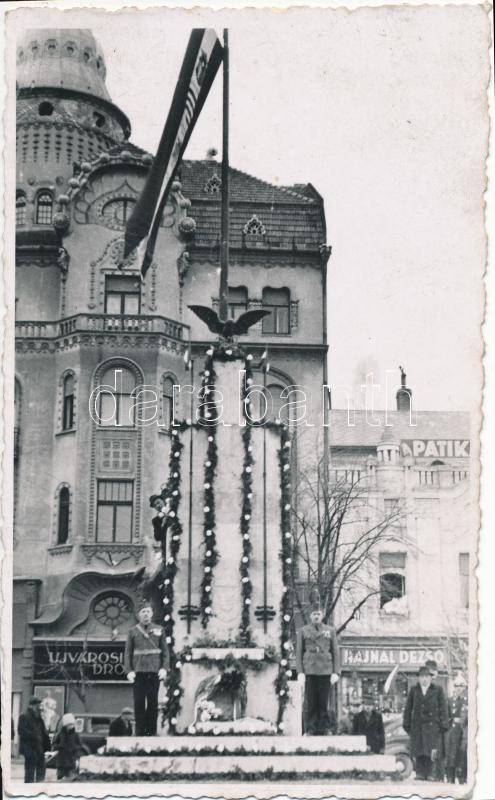 Leírás: 1941 Nagyvárad, Országzászló, Fekete Sas szálloda, Újvárosi és Hajnal Dezső kereskedései / national flag, hotel, shops, photo