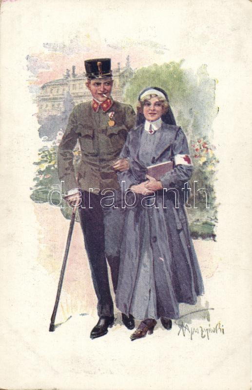 Soldier with red cross nurse, artist signed https://www.darabanth.com/hu/207-Gyorsarveres/207.0/Kepeslapok/Katonai~600046/Soldier-with-red-cross-nurse-artist-signed~II839087