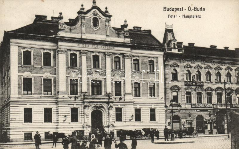 Leírás: Budapest III. Óbuda, Főtér, III. Kerületi Előljáróság, Müfoc terem, Budapesti Jobbpárti Takarékpénztár, fodrász (EK)