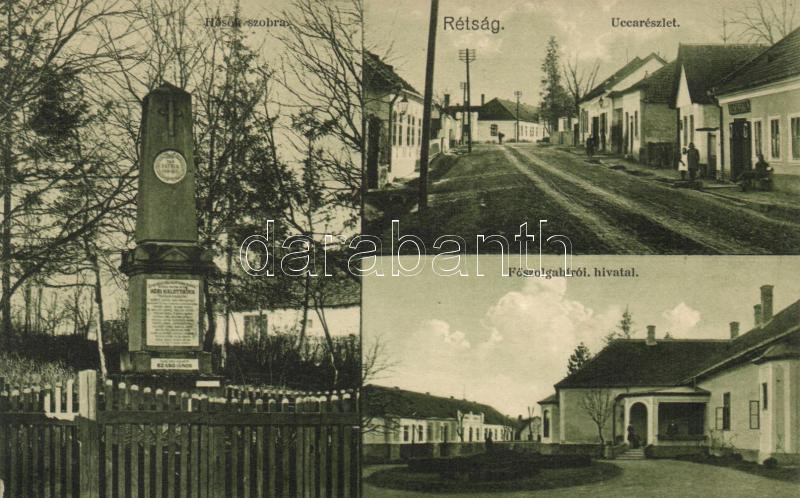 Leírás: Rétság, Hősök szobra, főszolgabírói hivatal, gyógyszertár
