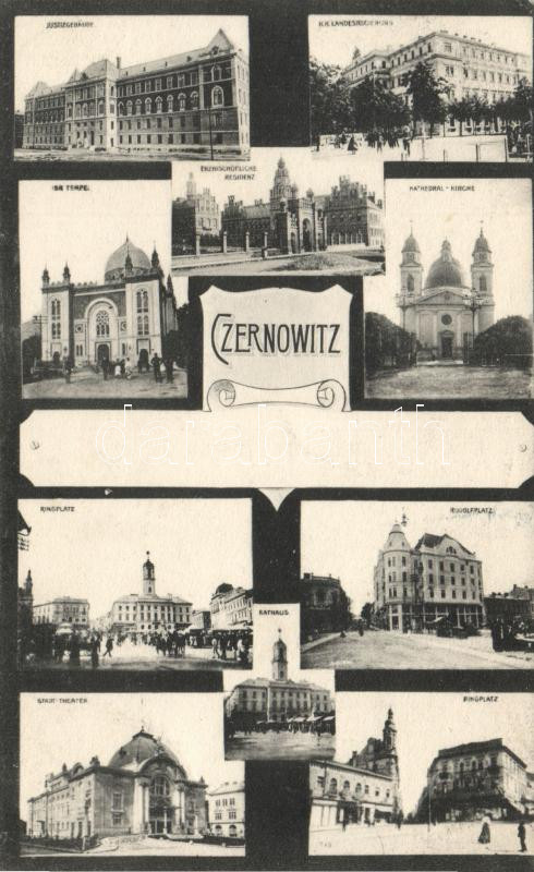 Chernivtsi, Czernowitz; multiview postcard with synagogue https://www.darabanth.com/hu/207-Gyorsarveres/207.0/Kepeslapok/Ukrajna~600167/Chernivtsi-Czernowitz-multiview-postcard-with-synagogue~II837184