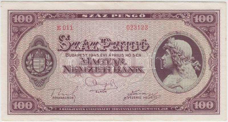 Leírás: 1945. 100P "E 011", vízjeles, "BÜNTETÉS" szóban "N" felett lemezhiba T:III