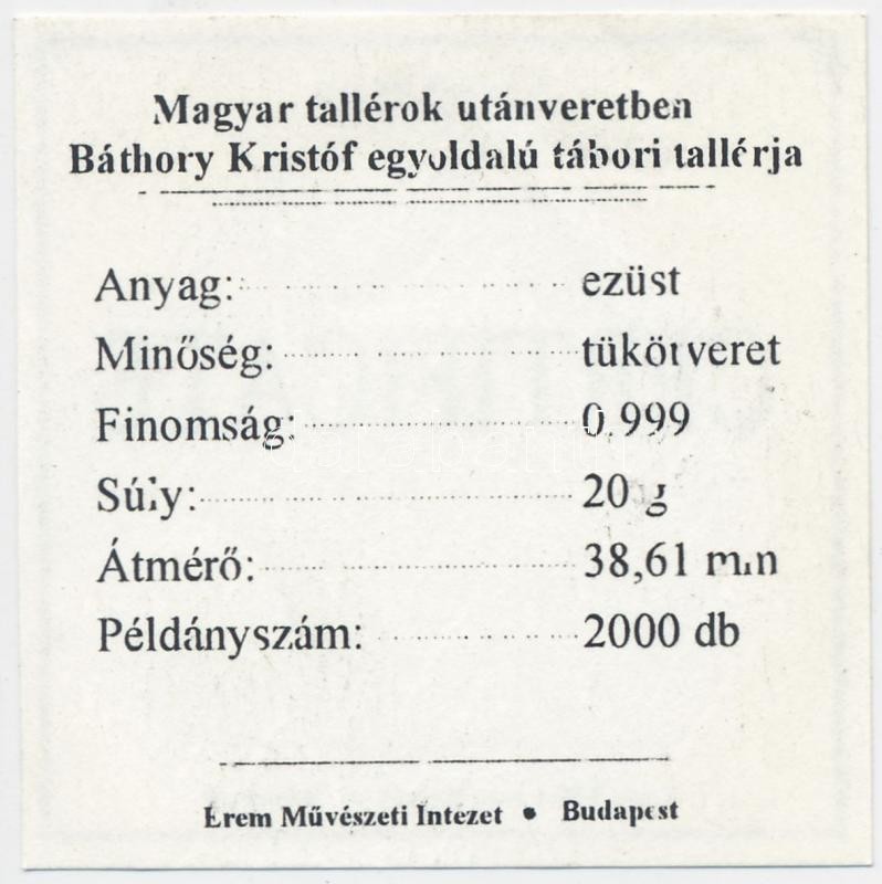 Leírás: Magyar tallérok utánveretben "Báthory Kristóf egyoldalú tábori tallérja 1580" Ag emlékérem (20g/0.999/38,6mm) T:PP Tanúsítvánnyal