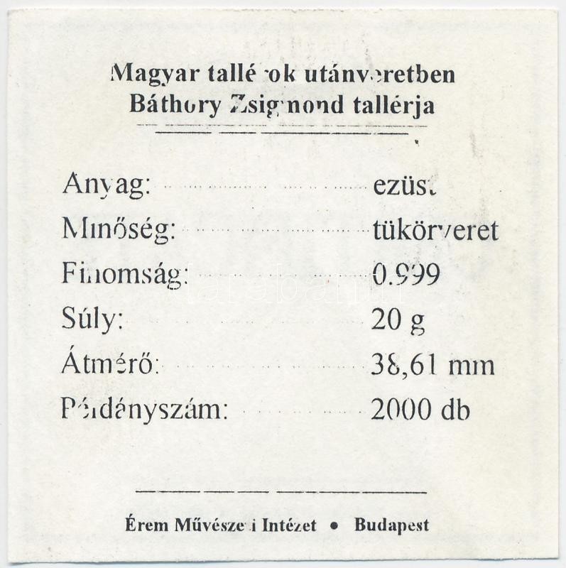 Leírás: Magyar tallérok utánveretben "Báthory Zsigmond tallérja 1589" Ag emlékérem (20g/0.999/38,6mm) T:PP Tanúsítvánnyal