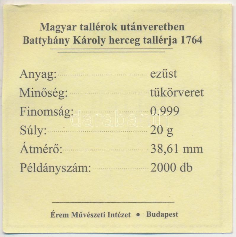 Leírás: Magyar tallérok utánveretben "Batthyány Károly herceg tallérja 1764" Ag emlékérem (20g/0.999/38,6mm) T:PP Tanúsítvánnyal