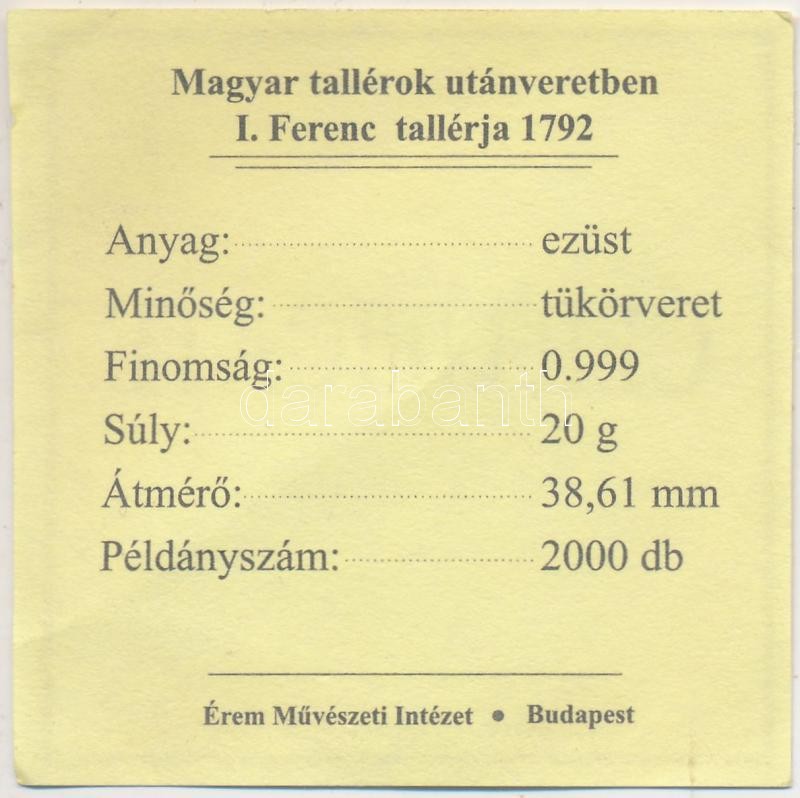 Leírás: Magyar tallérok utánveretben "I. Ferenc tallérja 1792" Ag emlékérem (20g/0.999/38,6mm) T:PP Tanúsítvánnyal