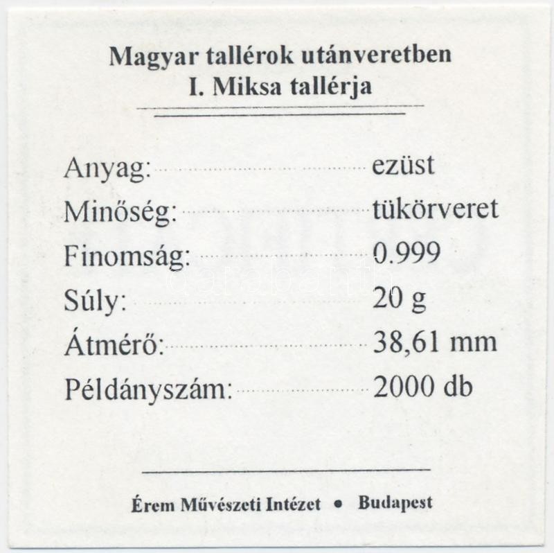 Leírás: Magyar tallérok utánveretben "I. Miksa tallérja 1574" Ag emlékérem (20g/0.999/38,6mm) T:PP Tanúsítvánnyal