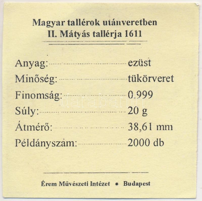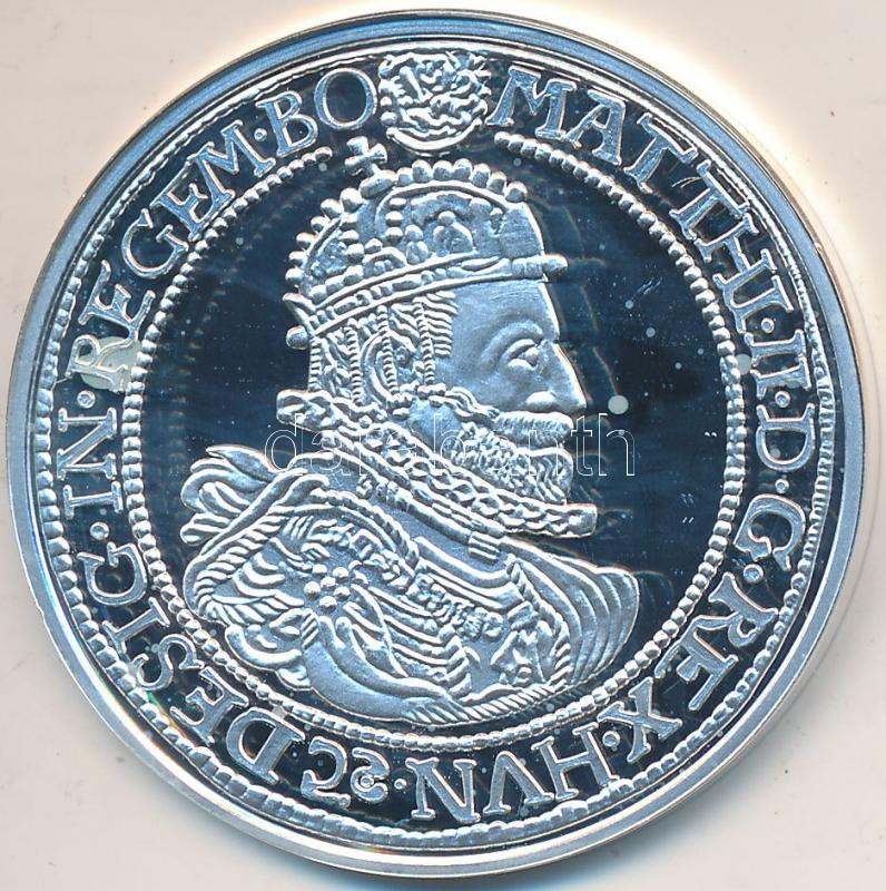Leírás: Magyar tallérok utánveretben "II. Mátyás tallérja 1611" Ag emlékérem (20g/0.999/38,6mm) T:PP Tanúsítvánnyal