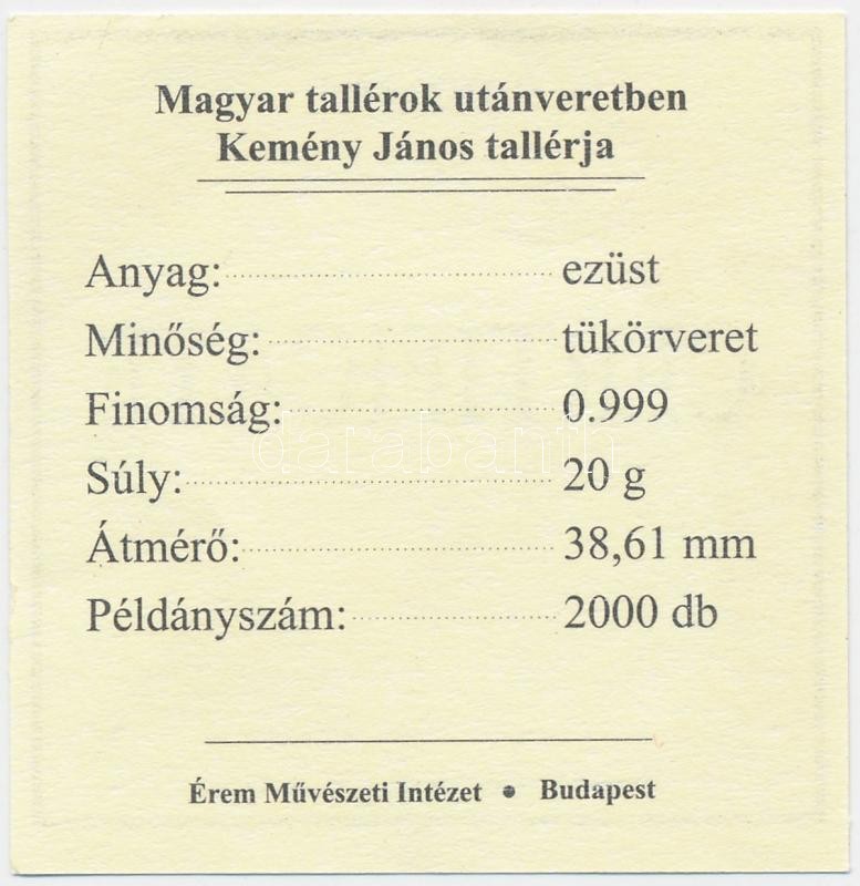 Leírás: Magyar tallérok utánveretben "Kemény János tallérja 1661" Ag emlékérem (20g/0.999/38,6mm) T:PP Tanúsítvánnyal