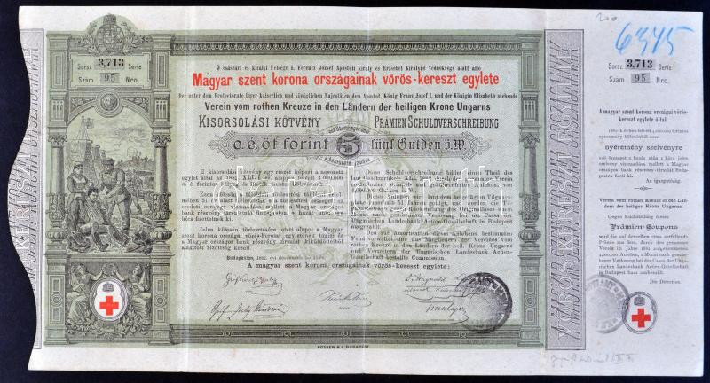 Leírás: Budapest 1882. "Magyar szent korona országainak vörös-kereszt egylete" Kisorsolási kötvény 5Ft-ról osztrák pecséttel T:III