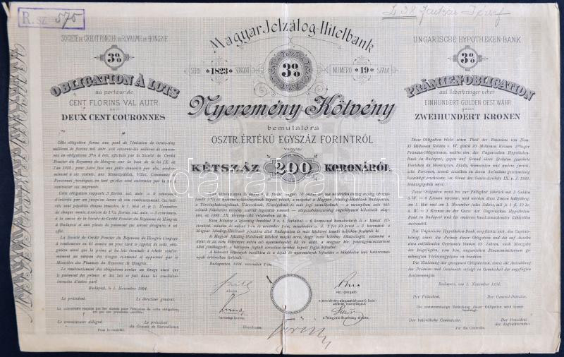 Leírás: Budapest 1894. "Magyar Jelzálog-Hitelbank Nyeremény-Kötvény" 200K-ról, 3 nyelven, szárazpecséttel, szelvényekkel T:III