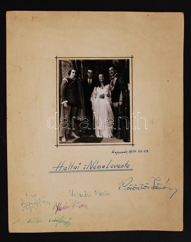 Leírás: Heltai Jenő: Néma Levente. 1956, Kaposvári előadás, kartonra ragasztva, színészek aláírásaival