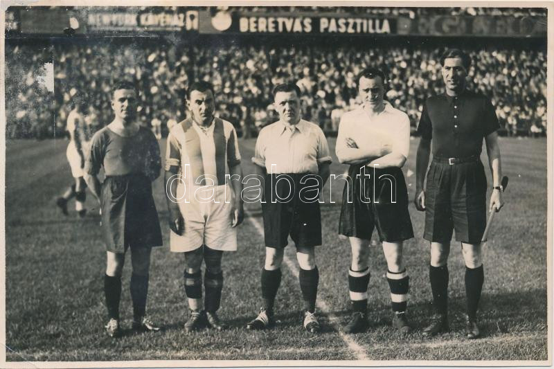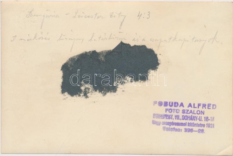cca 1920-1930 Pobuda Alfréd: Hungaria – Leicester City 4:3, a mérkőzés csapatkapitányai és bírái, pecséttel jelzett, feliratozott vintage sportfotó, 11x17 cm