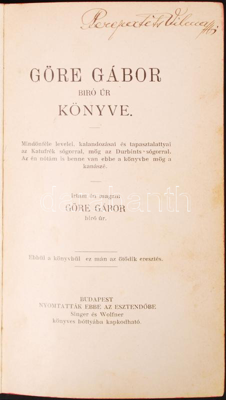 Gárdonyi Géza: Göre Gábor bíró úr könyve. Bp., 1905, Singer és Wolfner. Mühlbeck Károly szövegközti illusztrációival, kiadói festett, aranyozott egészvászon kötésben