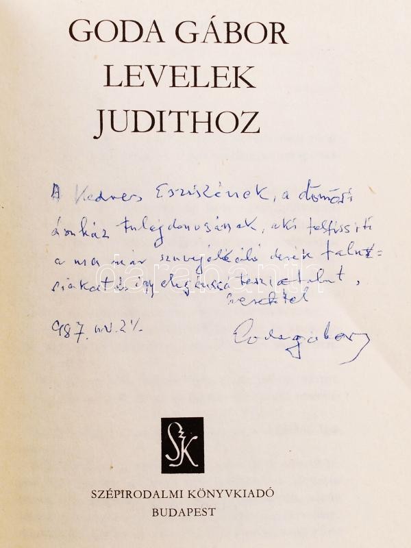 Goda Gábor: Levelek Judithoz. Dedikált! Bp., 1981, Szépirodalmi Könyvk... https://www.darabanth.com/hu/208-Gyorsarveres/208.0/Festmeny-mutargy-papirregiseg-egyeb/Konyvek-Egyeb-ritkasagok~30040/Goda-Gabor-Levelek-Judithoz-Dedikalt-Bp-1981-Szepirodalmi-Konyvkiado-Kiadoi-egeszvasz~II848022