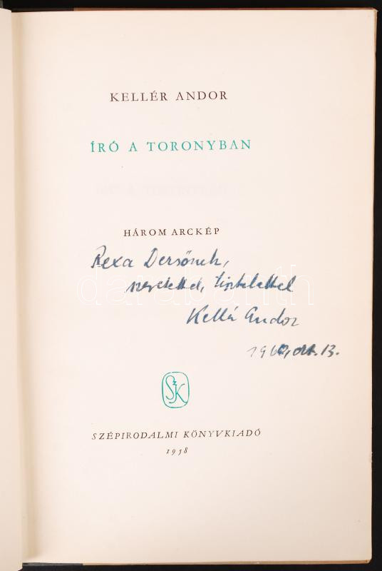 Kellér Andor: Író a toronyban. Három arckép. Rexa Dezsőnek dedikálva! ... https://www.darabanth.com/hu/208-Gyorsarveres/208.0/Festmeny-mutargy-papirregiseg-egyeb/Konyvek-Egyeb-ritkasagok~30040/Keller-Andor-Iro-a-toronyban-Harom-arckep-Rexa-Dezsonek-dedikalva-Bp-1958-Szepirodalm~II851493