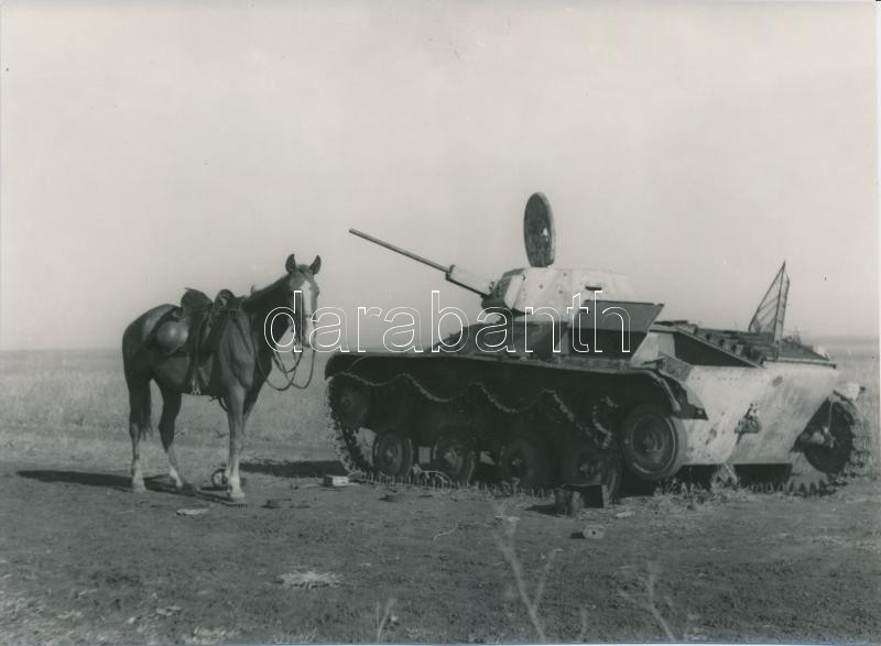 1942 Thöresz Dezső (1902-1963): Találkozás. A 2. magyar hadsereg kivonulása a Don-kanyarhoz. A szerző az oda utat fényképezte, kb. 130-150 eredeti negatív őrzi a katonák harctérre vonulását, ez a kép mai másolat a gyűjteményben található eredeti negatívról, 12x17 cm / military photo, tank