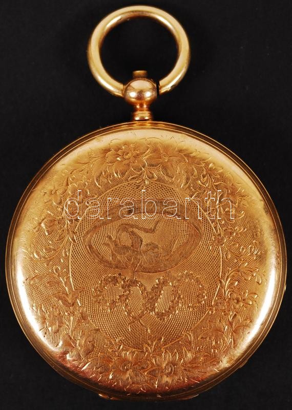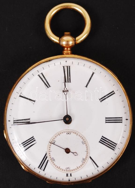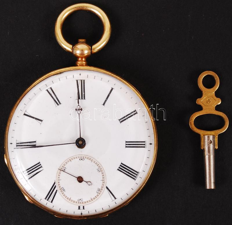 cca 1890 18K arany tokos zsebóra kulcsos szerkezettel, kézi csiszolású üveggel, kulccsal, el el induló, de tisztításra szoruló szerkezettel / 18C gold watch, with key and hand made glass. Mechanic needs cleaning d: 46 cm