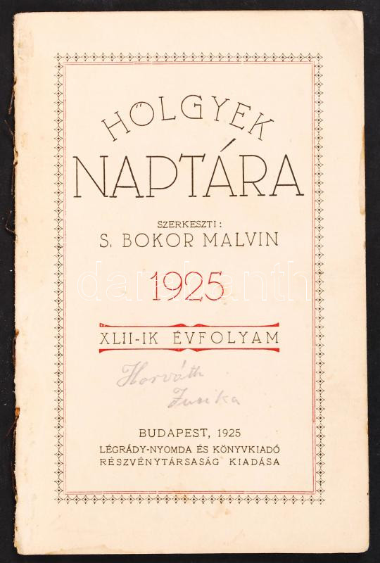 1925 S. Bokor Malvin(szerk.): Hölgyek naptára, XLII. évfolyam https://www.darabanth.com/hu/208-Gyorsarveres/208.0/Festmeny-mutargy-papirregiseg-egyeb/Nyomtatvanyok~30012/1925-S-Bokor-Malvinszerk-Holgyek-naptara-XLII-evfolyam~II850884