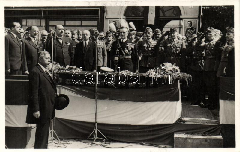 Leírás: Szatmárnémeti bevonulás; Horthy Miklós, Teleki Pál, Hóman Bálint, Reményi-Schneller Lajos, Teleki Mihály, vitéz Bartha Károly, Werth Henrik, vitéz Koós Miklós tábornok, vitéz Keresztes-Fischer Lajos / entry of the Hungarian troops 'vissza' So.Stpl