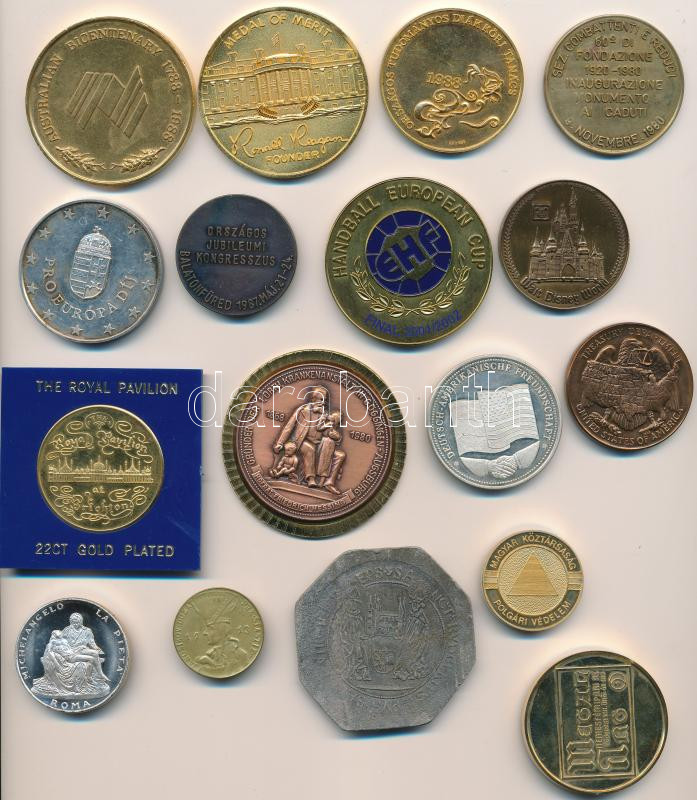 Leírás: 20db vegyes fém és bronz emlékérem, sok tokos, magyar és külföldi T:vegyes