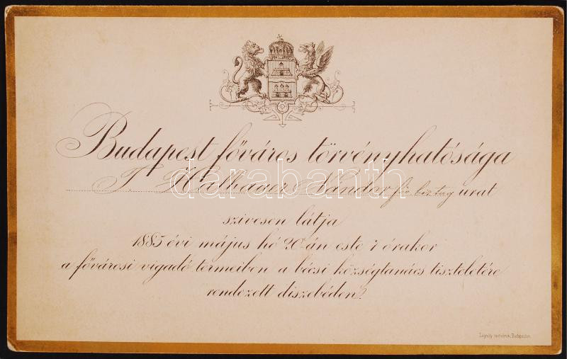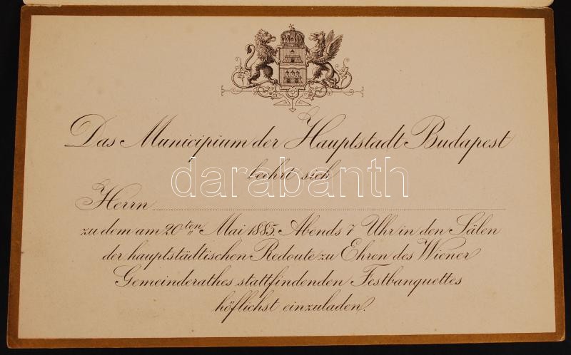 1885 Kétnyelvű meghívó a budapesti törvényhatóság által a bécsi község... https://www.darabanth.com/hu/209-Gyorsarveres/209.0/Festmeny-mutargy-papirregiseg-egyeb/Nyomtatvanyok~600132/1885-Ketnyelvu-meghivo-a-budapesti-torvenyhatosag-altal-a-becsi-kozsegtanacs-reszere-~II860652