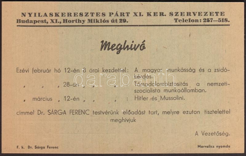 cca 1939-1945 A Nyilaskeresztes Párt XI. kerületi szervezetének kitölt... https://www.darabanth.com/hu/209-Gyorsarveres/209.0/Festmeny-mutargy-papirregiseg-egyeb/Nyomtatvanyok~600132/cca-1939-1945-A-Nyilaskeresztes-Part-XI-keruleti-szervezetenek-kitoltetlen-meghivoja~II858562