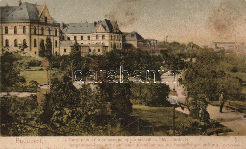 Leírás: Budapest II. Margit park, Irgalmasrend új kórháza, Lukács fürdő, Ganz Antal kiadása (fl)