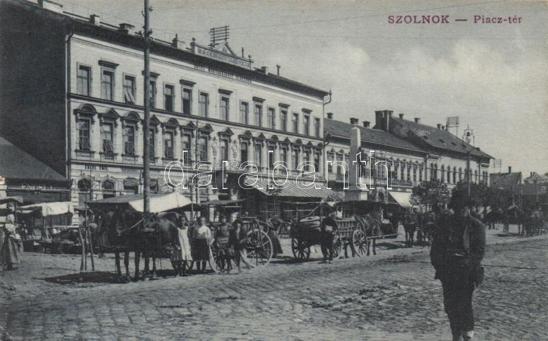 Leírás: Szolnok, Piac tér, megyei Takarékpénztár, Magyar Király szálloda, Engel Emil boltja (b)