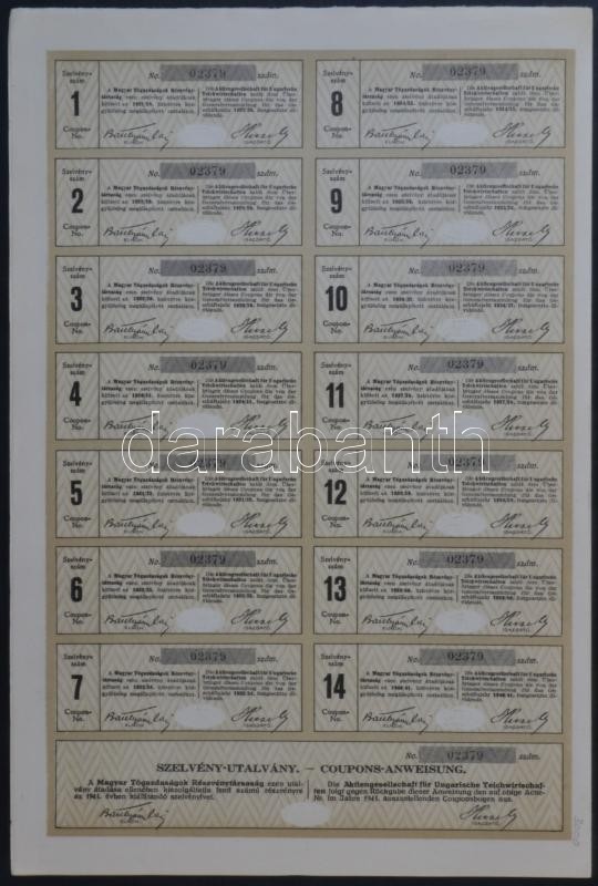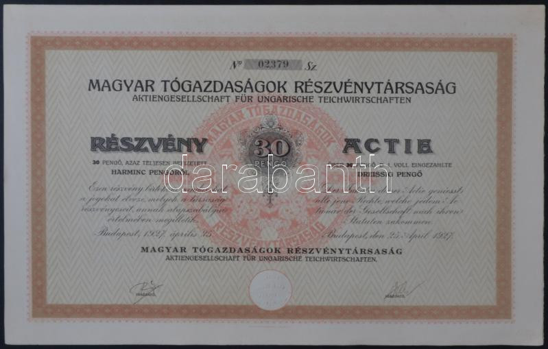 Leírás: Budapest 1927. "Magyar Tógazdaságok Részvénytársaság" részvénye 30P-ről, szárazpecséttel és szelvényekkel T:I-