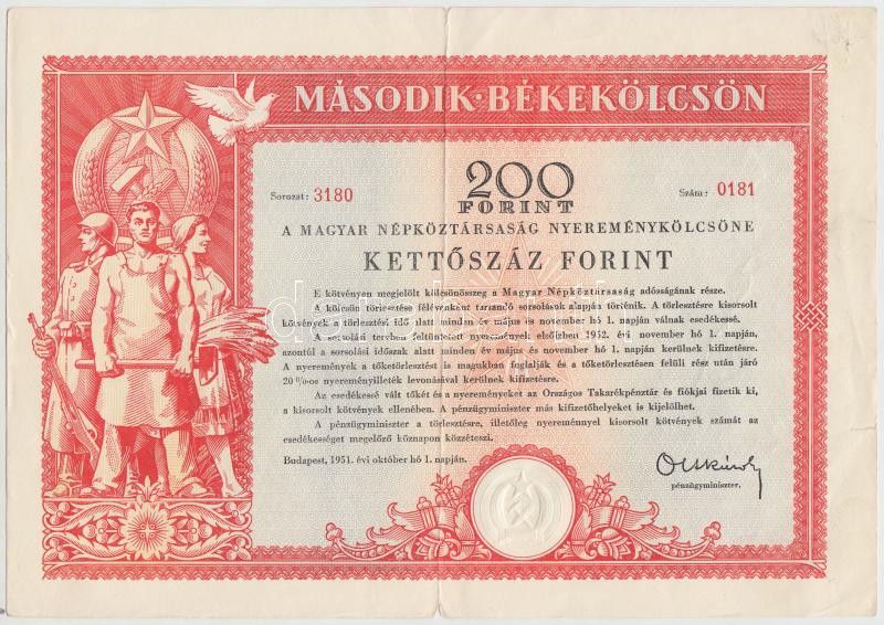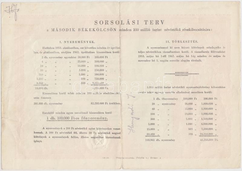 Leírás: Budapest 1951. "Második Békekölcsön" nyereménykölcsöne 200Ft-ról T:III