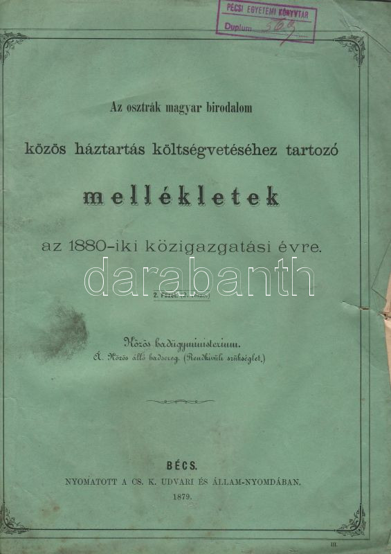 1879 Az osztrák-magyar birodalom közös háztartás költségvetéséhez tartozó mellékletek. Közös hadügyminisztérium Közös álló hadsereg (rendkívüli szükséglet); Cs. K. udvari nyomda (kissé szakadozott)