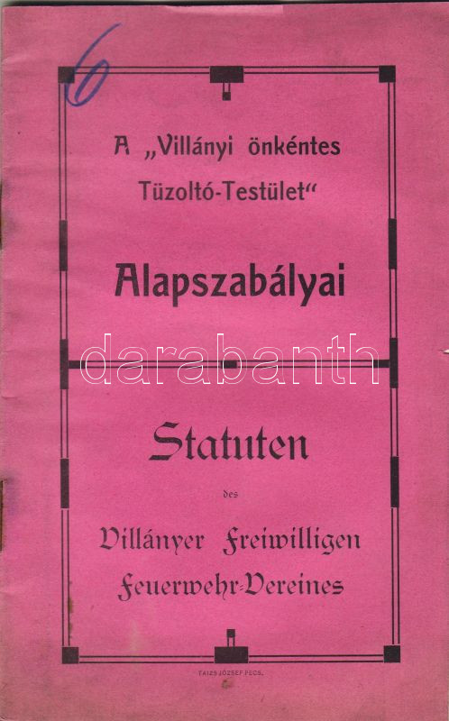 1905 A Villányi Önkéntes Tűzoltó-Testület alapszabályau magyar és néme... https://www.darabanth.com/hu/21-Gyorsarveres/21.0/Festmeny-mutargy-papirregiseg-egyeb/Nyomtatvanyok~147/1905-A-Villanyi-Onkentes-Tuzolto-Testulet-alapszabalyau-magyar-es-nemet-nyelven-Taizs-Joz~II39336