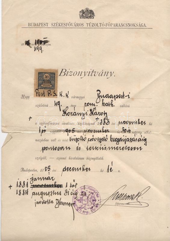 1905 Bizonyítvány a budapesti Tűzoltó- Főparancsnokságtól kiválló csőv... https://www.darabanth.com/hu/21-Gyorsarveres/21.0/Festmeny-mutargy-papirregiseg-egyeb/Nyomtatvanyok~147/1905-Bizonyitvany-a-budapesti-Tuzolto-Foparancsnoksagtol-kivallo-csovezetoi-munkarol~II39492